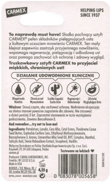 To naprawdę must have! Słodko pachnący sztyft CARMEX® pełen składników pielęgnujących usta z kultowym uczuciem mrowienia CARMEX. Ten mały klejnot zapewnia zastrzyk przyjemnego nawilżenia, wspomaga regenerację, pielęgnację i odbudowę ust oraz pomaga zachować ich ochronę i zdrowy wygląd.