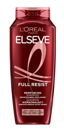 Przywróć swoim włosom doskonałą kondycję! Stres, zmiany pór roku, szczotkowanie i stylizacja... Włosy stają się słabsze, cieńsze i coraz częściej łamią się podczas szczotkowania. Szampon wzmacniający Elseve Full Resist została stworzony do włosów osłabionych z tendencją do wypadania z powodu łamliwości. Wypróbuj naszą nową wzmacniającą formułę wzbogaconą w aminexil, biotynę i argininę. Chroń swoje włosy przed codziennymi zniszczeniami z Szamponem Elseve Full Resist!